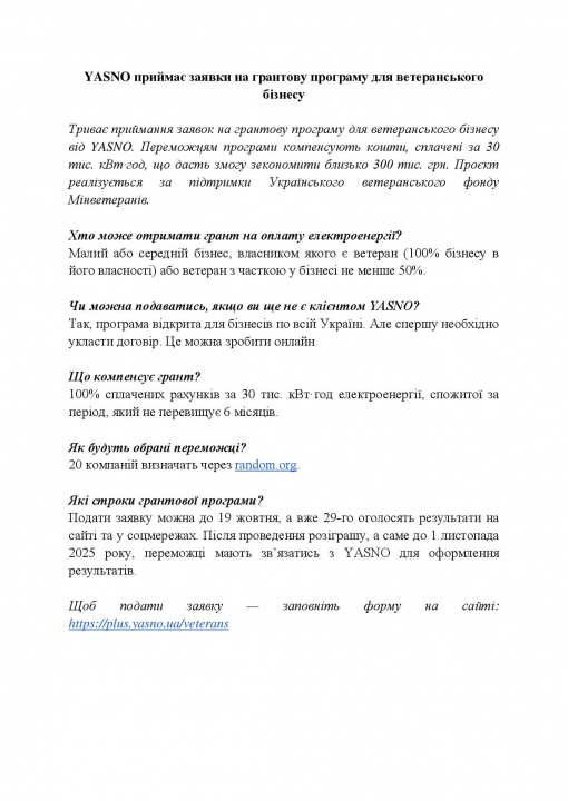 YASNO приймає заявки на грантову програму для ветеранського бізнесу