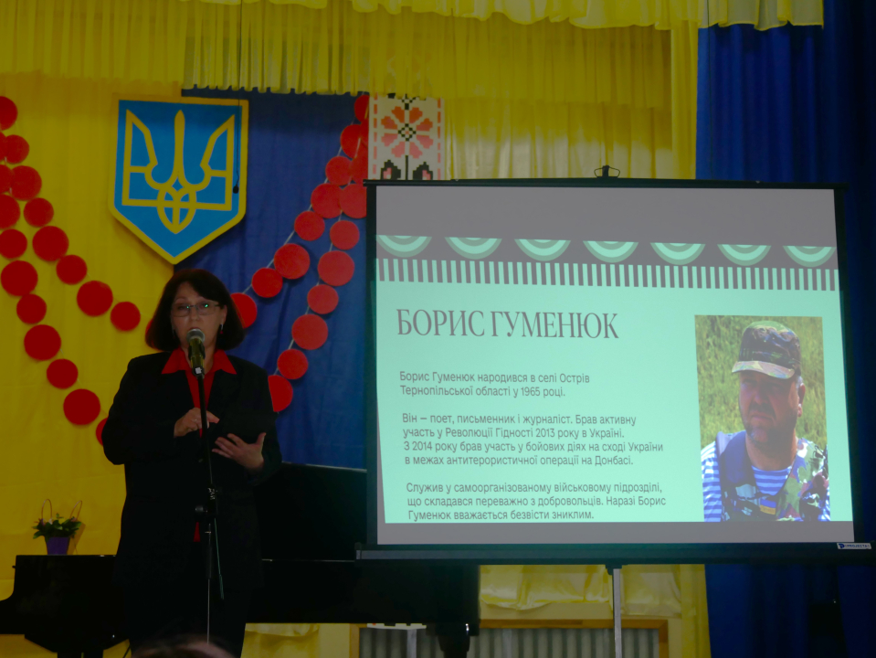 Свій виступ вона завершувала рядками добровольця, поета, письменника, журналіста Бориса Гуменюка, з яким особисто знайома. Зараз мужній воїн рахується зниклим безвісти… Людмила Чичук прочитала вірш «Заповіт», який став підгрунтям концерта-присвяти. У тиші залу лунали слова правди про війну, про незламних захисників…Вона дякувала покровчанам за пам'ять про тих, хто відстоює рідну землю.
