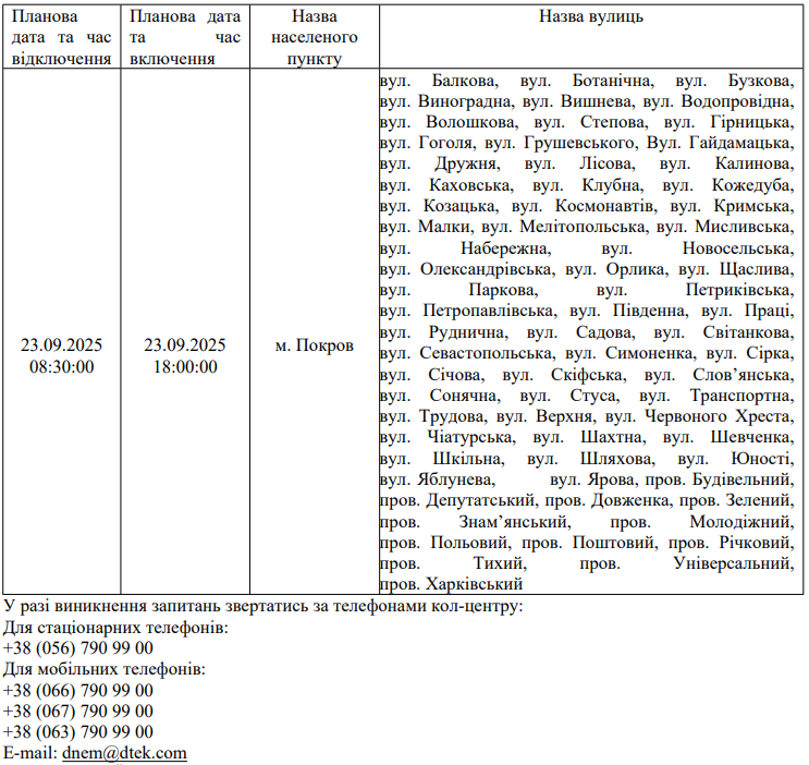 З метою підвищення надійності електропостачання та попередження аварій в електричних мережах АТ «ДТЕК Дніпровські електромережі» 23.09.2025 р проводитимуться профілактичні роботи в межах Покровської міської територіальної громади: