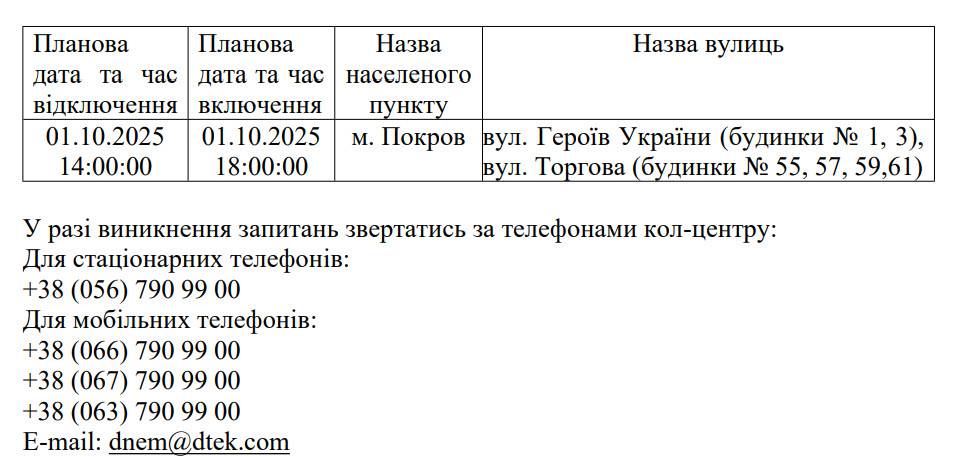 З метою підвищення надійності електропостачання та попередження аварій в електричних мережах АТ «ДТЕК Дніпровські електромережі» 01.10.2025 р проводитимуться профілактичні роботи в межах Покровської міської територіальної громади: