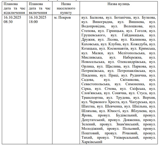 З метою підвищення надійності електропостачання та попередження аварій в електричних мережах АТ «ДТЕК Дніпровські електромережі» 16.10.2025 р проводитимуться профілактичні роботи в межах Покровської міської територіальної громади: