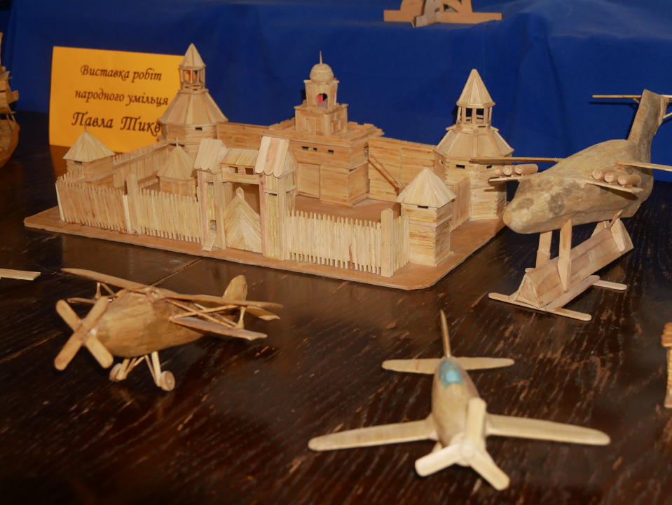 Серед представлених — вироби народного майстра Павла Тикви, який не одне десятиліття захоплюється сірникарством. Звичайні сірники у його руках перетворюються на мініатюрні храми, моделі літаків та вітрильників, фортеці та інші архітектурні дива. Цей вид декоративно-ужиткового мистецтва вимагає виняткової точності, терпіння та просторової уяви. Кожна робота – це зразок тонкої інженерної думки і витонченої фантазії, що розкриває потенціал звичайних речей у руках справжнього майстра.