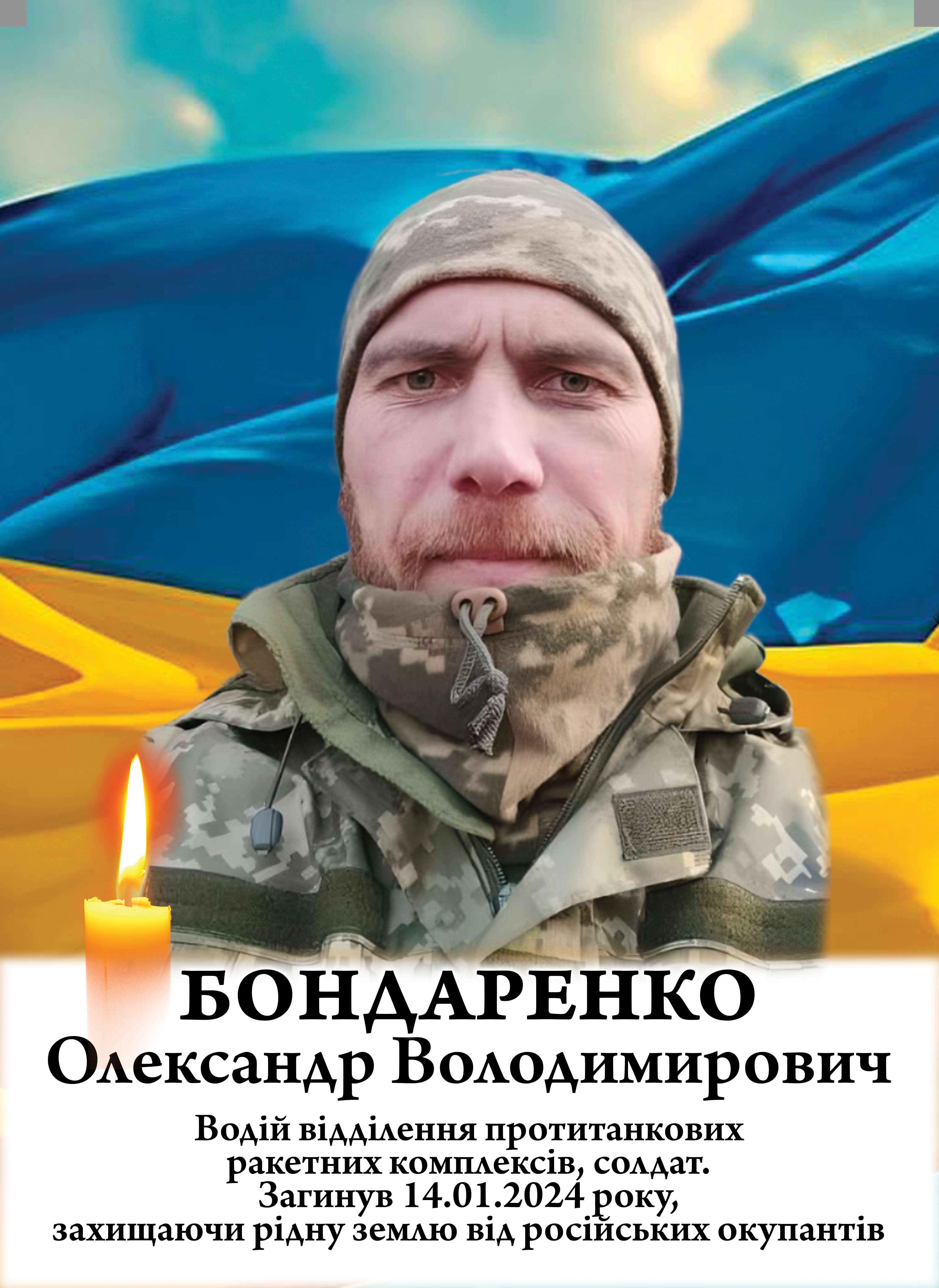 Олександр Бондаренко загинув 14 січня 2024 року біля населеного пункту Хромове, Донецької області, виявивши мужність, стійкість і відданість присязі.