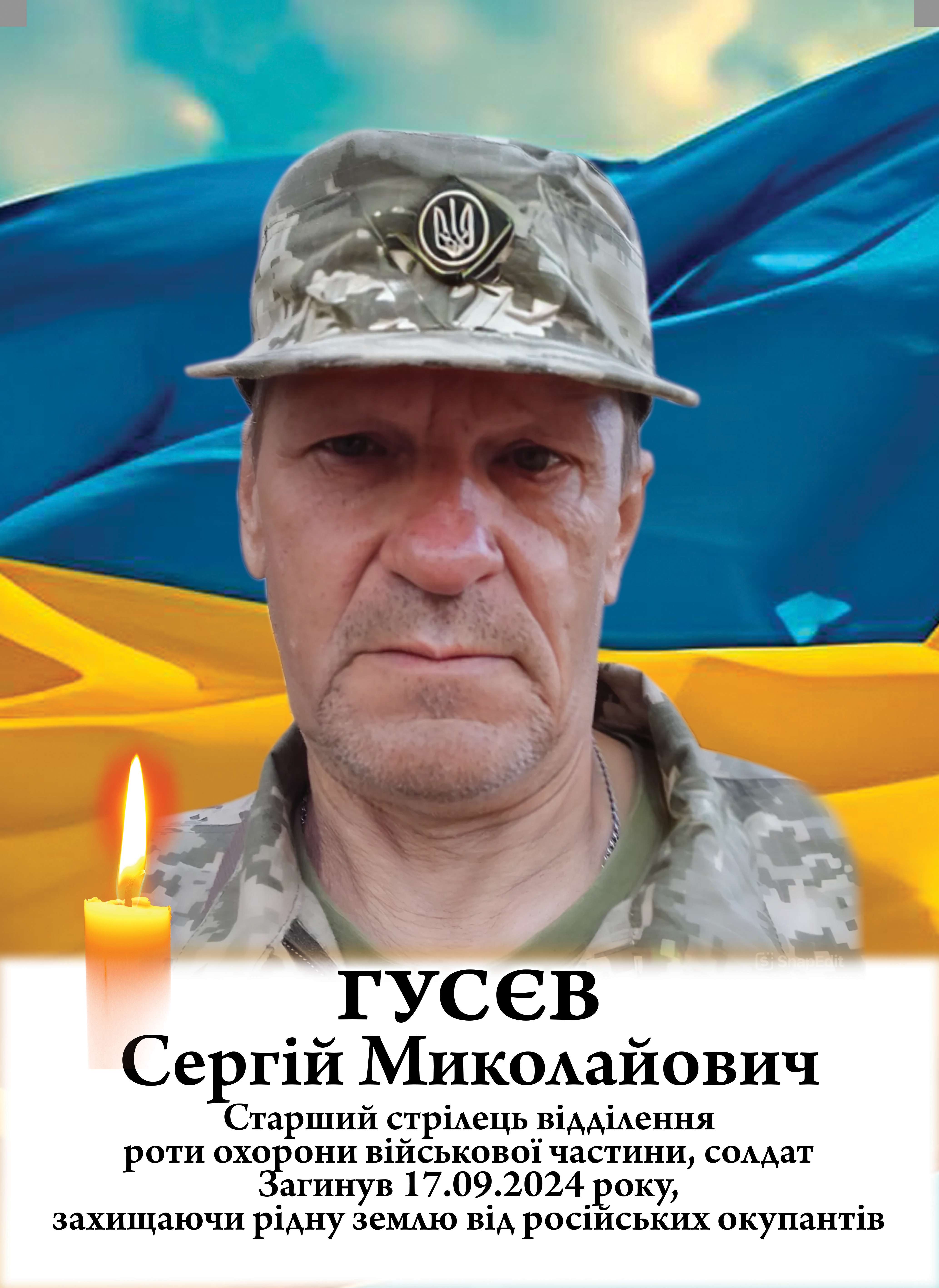 17 вересня 2024 року Сергій Гусєв загинув під час виконання бойового завдання в населеному пункті Комишуваха Запорізької області, виявивши мужність, стійкість та відданість присязі. У захисника залишилися дружина та троє синів. Його згадують як доброзичливого, надійного, людину щирої вдачі, який завжди допомагав іншим.