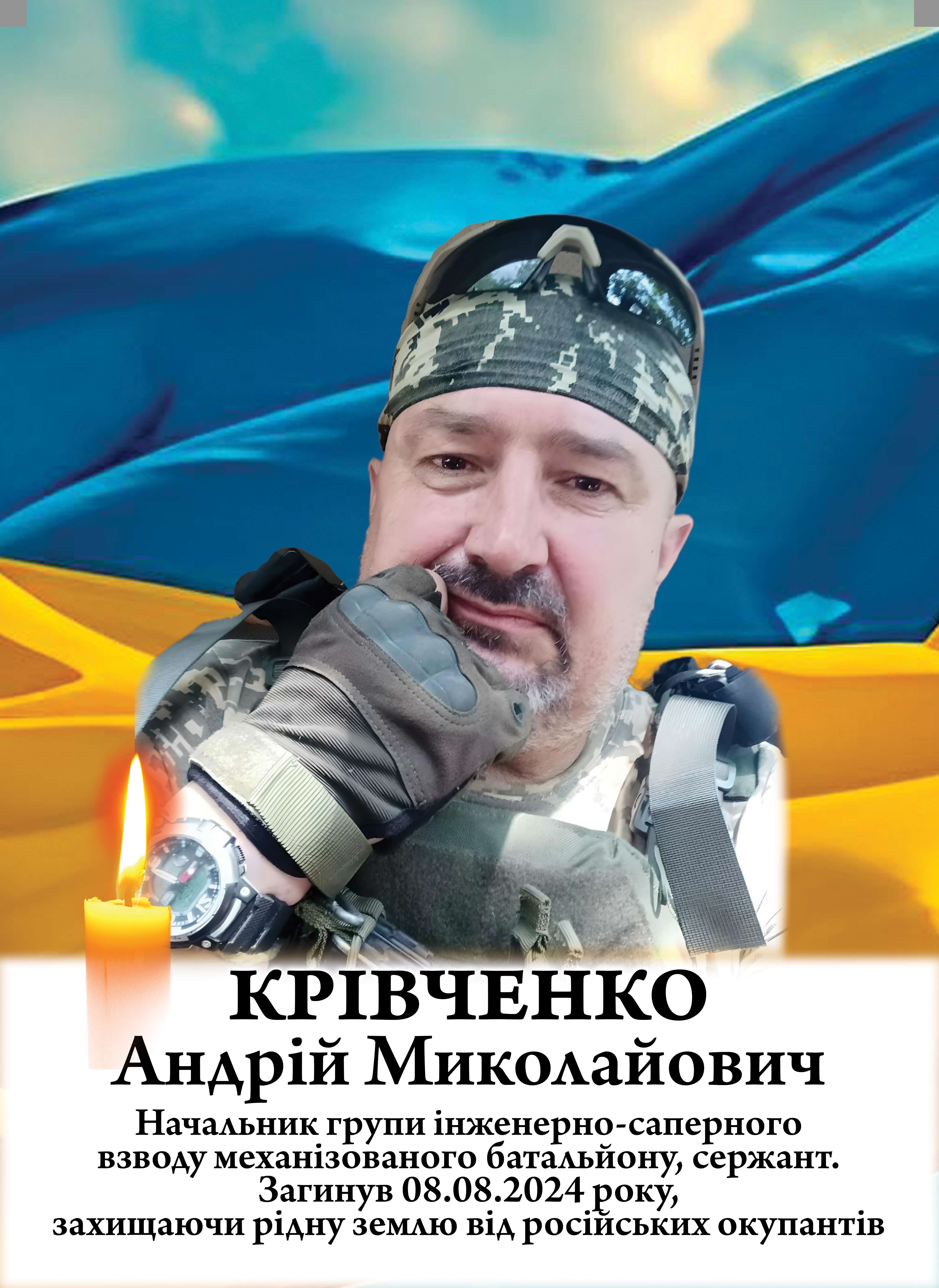 29 липня 2024 року під час виконання бойового завдання поблизу населеного пункту Золочів Харківської області сержант Андрій Крівченко внаслідок ворожого авіаційного удару під час розмінування, отримав важкі поранення не сумісні з життям... 8 серпня його серце перестало битися. Герою було 51 рік...