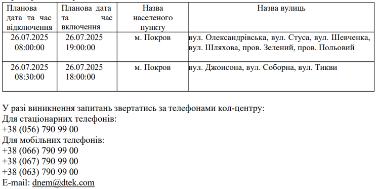 З метою підвищення надійності електропостачання та попередження аварій в електричних мережах АТ «ДТЕК Дніпровські електромережі» 26.07.2025 р проводитимуться профілактичні роботи в межах Покровської міської територіальної громади:
