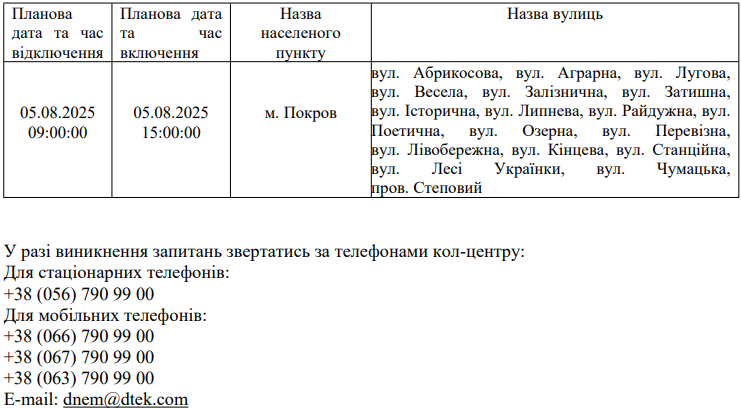 З метою підвищення надійності електропостачання та попередження аварій в електричних мережах АТ «ДТЕК Дніпровські електромережі» 05.08.2025 р проводитимуться профілактичні роботи в межах Покровської міської територіальної громади: