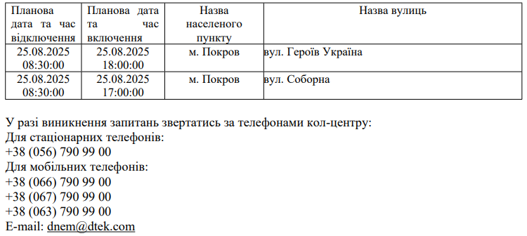 З метою підвищення надійності електропостачання та попередження аварій в електричних мережах АТ «ДТЕК Дніпровські електромережі» 25.08.2025 р проводитимуться профілактичні роботи в межах Покровської міської територіальної громади: