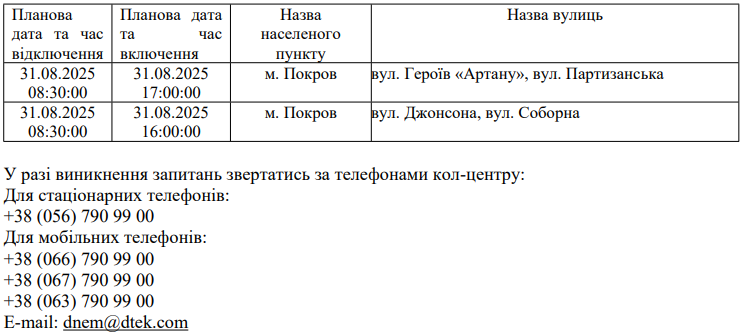 З метою підвищення надійності електропостачання та попередження аварій в електричних мережах АТ «ДТЕК Дніпровські електромережі» 31.08.2025 р проводитимуться профілактичні роботи в межах Покровської міської територіальної громади:
