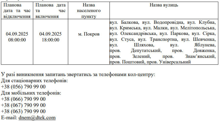 З метою підвищення надійності електропостачання та попередження аварій в електричних мережах АТ «ДТЕК Дніпровські електромережі» 04.09.2025 р проводитимуться профілактичні роботи в межах Покровської міської територіальної громади: