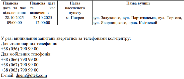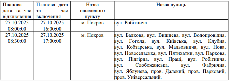 З метою підвищення надійності електропостачання та попередження аварій в електричних мережах АТ «ДТЕК Дніпровські електромережі» 27.10.2025, 28.10.2025 р проводитимуться профілактичні роботи в межах Покровської міської територіальної громади: