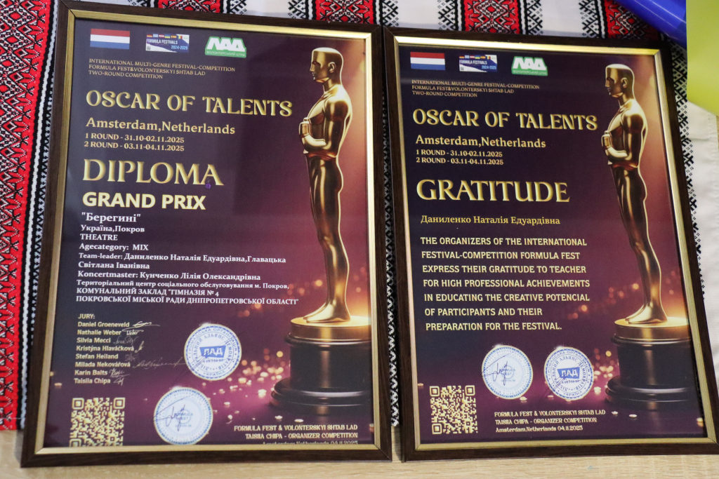 Робота дітей і дорослих стала переможною у двотуровому конкурсі «Формула успіху» та благодійному мистецькому проєкті «Оскар талантів». Це визнання стало не лише підсумком їхньої праці, а й культурним меседжем, що підкреслив глибоку українську ідентичність, спадковість традицій і єдність поколінь. Важливо й те, що частина коштів, отриманих у межах конкурсу, була спрямована на підтримку Збройних сил України та гуманітарні потреби.