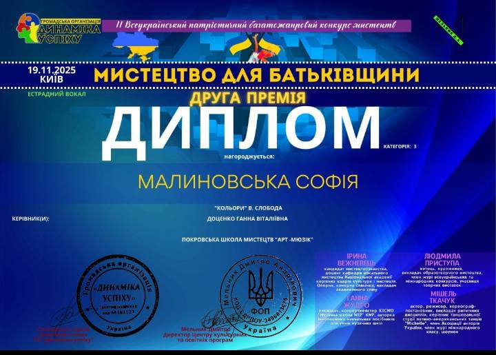 Теплі привітання й Софії Малиновській - переможниці ІІ Всеукраїнського патріотичного багатожанрового конкурсу мистецтв «Мистецтво для Батьківщини». Вихованка Ганни Доценко виборола другу премію творчого конкурсу, поповнивши скарбницю творчих досягнень школи ще однією яскравою перемогою.