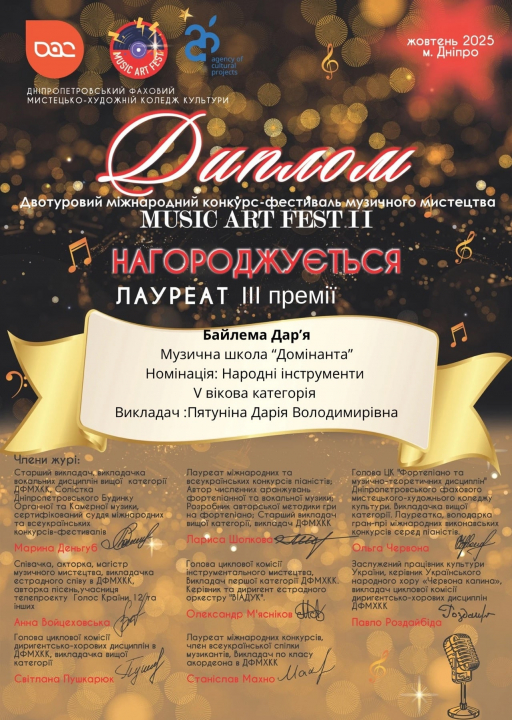 Яскравими є досягнення вихованців музичної школи «Домінанта». Лауреатами двотурового Міжнародного конкурсу-фестивалю музичного мистецтва «MUSIC ART FEST II» стали Марія Фролікова (ІІ премія) та Дар’я Байлема (ІІІ премія). Наставницею юних виконавиць є викладач Дарія Пятуніна.