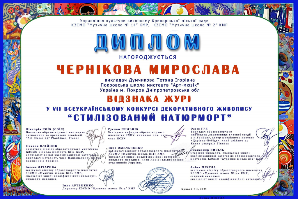 Високі оцінки за участь у VII Всеукраїнському конкурсі декоративного живопису «Стилізований натюрморт» отримали й вихованці Тетяни Думчикової. Їхні роботи відзначено за оригінальність та художній смак. Дипломом з відзнакою журі нагородило Мирославу Чернікову, а грамотами за участь - Марію Хижняк, Анну Таран, Ангеліну Константиненко та Вікторію Журавель.