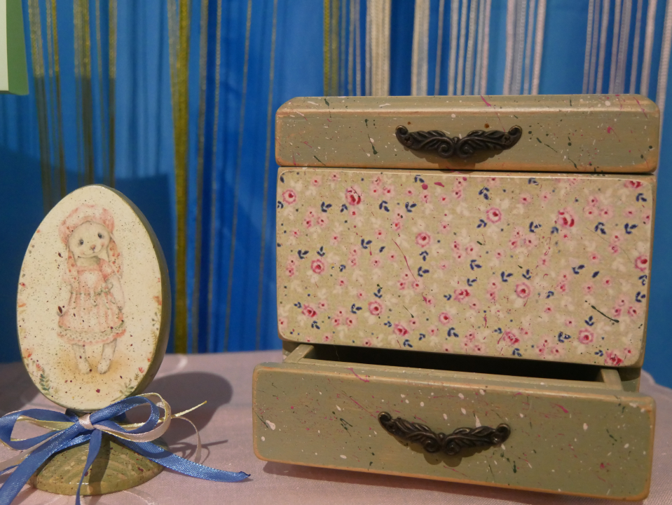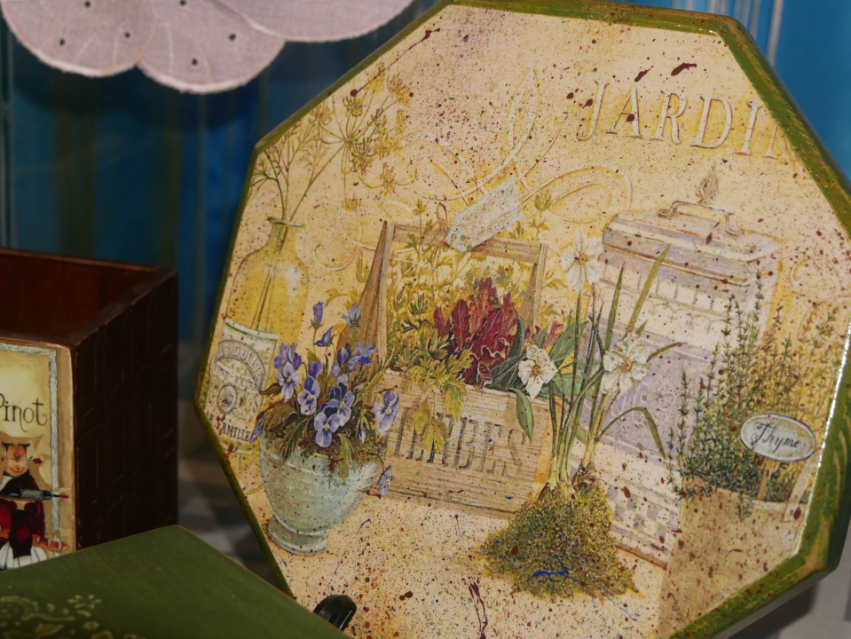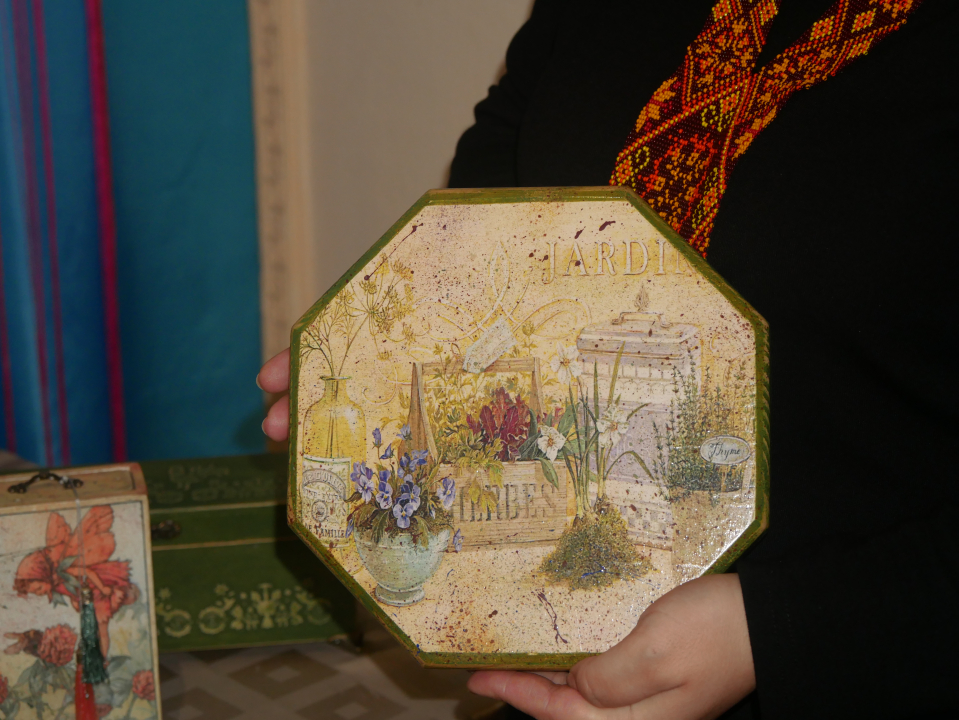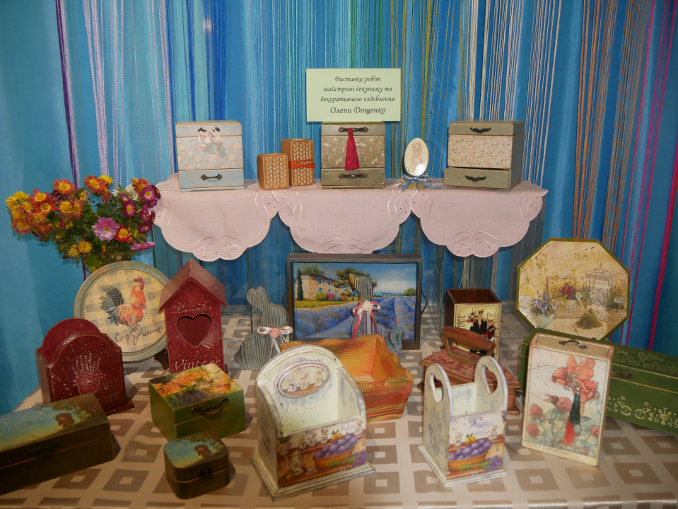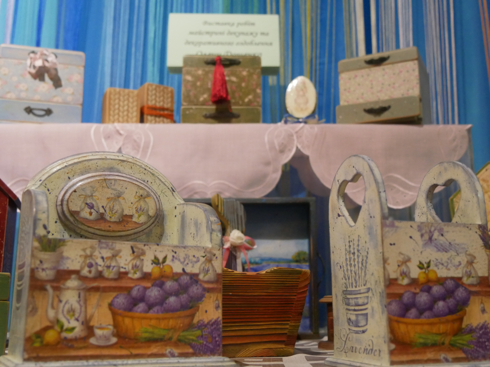 Не залишають байдужими роботи майстрині декупажу, Олени Дощенко. Її стильні шухлядки, підноси, скриньки, сувеніри — це предмети, що поєднують вишуканість і практичність. Техніка декупажу дозволяє перетворити звичайні речі на приємні інтер’єрні прикраси, створюючи ефект ручного розпису. Кожен виріб — це маленька історія, сповнена кольору, ніжності та натхнення.