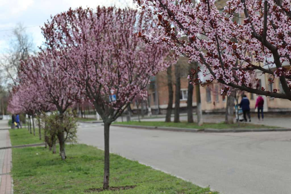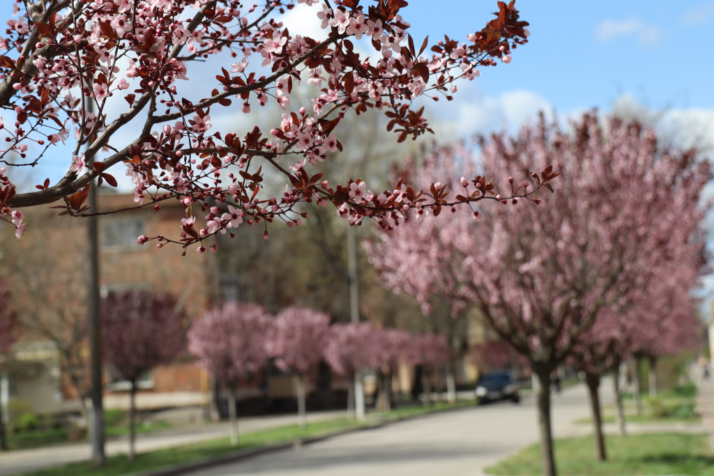 Ніжно-рожеві квіти декоративних слив додали весняного акценту міському простору. Їхні крони-хмаринки нікого не залишають байдужими, бо створюють особливий шарм, оздоблюючи вулиці Покрова.