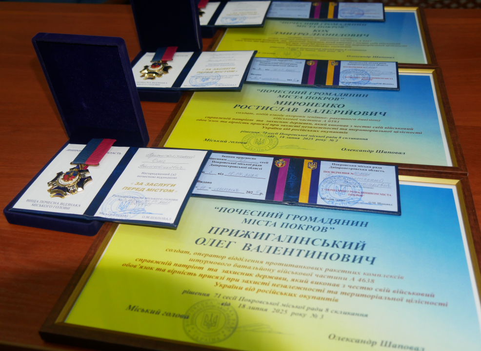 Офіцер третього відділу у місті Покров Нікопольського районного територіального центру комплектування та соціальної підтримки капітан Анатолій Пастух вручив медаль «Захиснику Вітчизни» (посмертно) рідним Почесного громадянина міста Олександра Кочергіна, орден «За мужність» III ступеня (посмертно) рідним Почесного громадянина міста Андрія Вожикова.