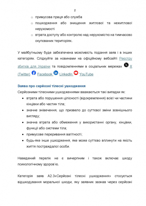 Слідкуйте за новинами на офіційному вебсайті Реєстру збитків для України та повідомленнями в соціальних мережах @ X (Twitter) О Facebook Ф LinkedIn О YouTube