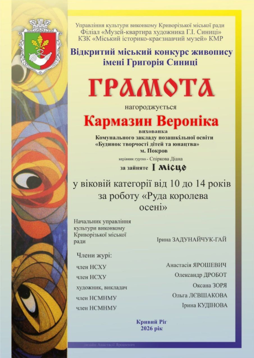 Вихованка гуртка «Акварелія» Будинку творчості дітей та юнацтва Вероніка Кармазин здобула перемогу у Відкритому конкурсі живопису імені Григорія Синиці «Звірята-пухнастики» (м. Кривий Ріг), виборовши І місце.