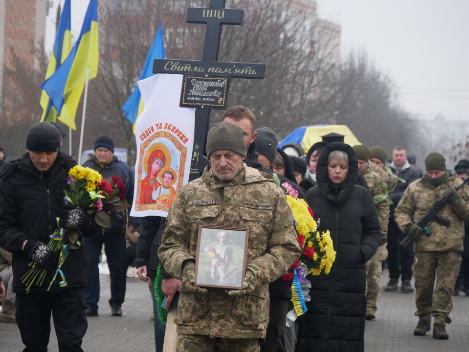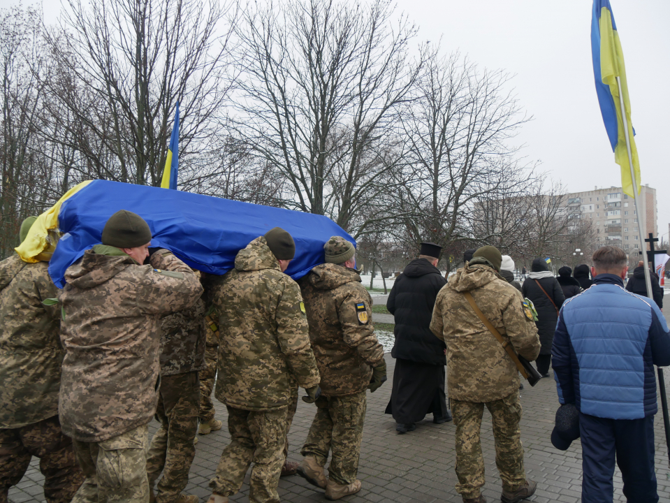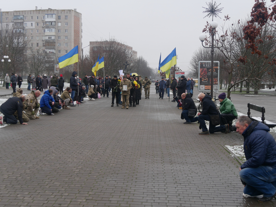 Рідні, друзі, представники влади, містяни вшановували воїна. Євгена проводжали через живий коридор пошани. Покровчани прихиляли коліна. Несли Захиснику квіти.