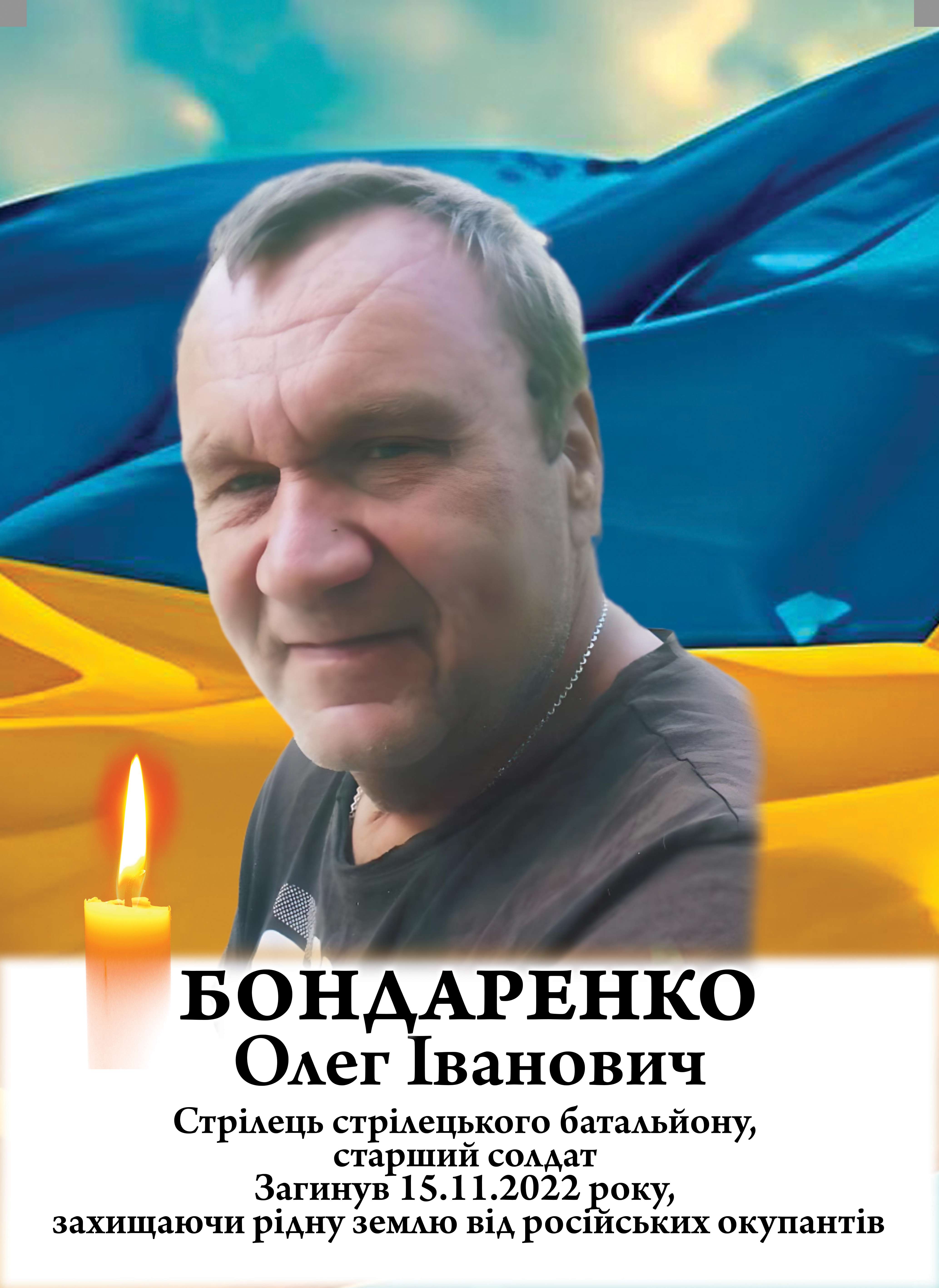 З повномасштабним вторгненням рф став на захист України. Стрілець стрілецького батальйону, старший солдат Олег Бондаренко воював на східному напрямку. Він загинув 15 листопада 2022 року поблизу с. Андріївка Сватівського р-ну, що на Луганщині, виявивши мужність, стійкість та відданість присязі. Воїну було 54 роки, в нього залишився син. Його згадують як відповідального, товариського, людину щирої вдачі, яка прагнула миру рідній землі.