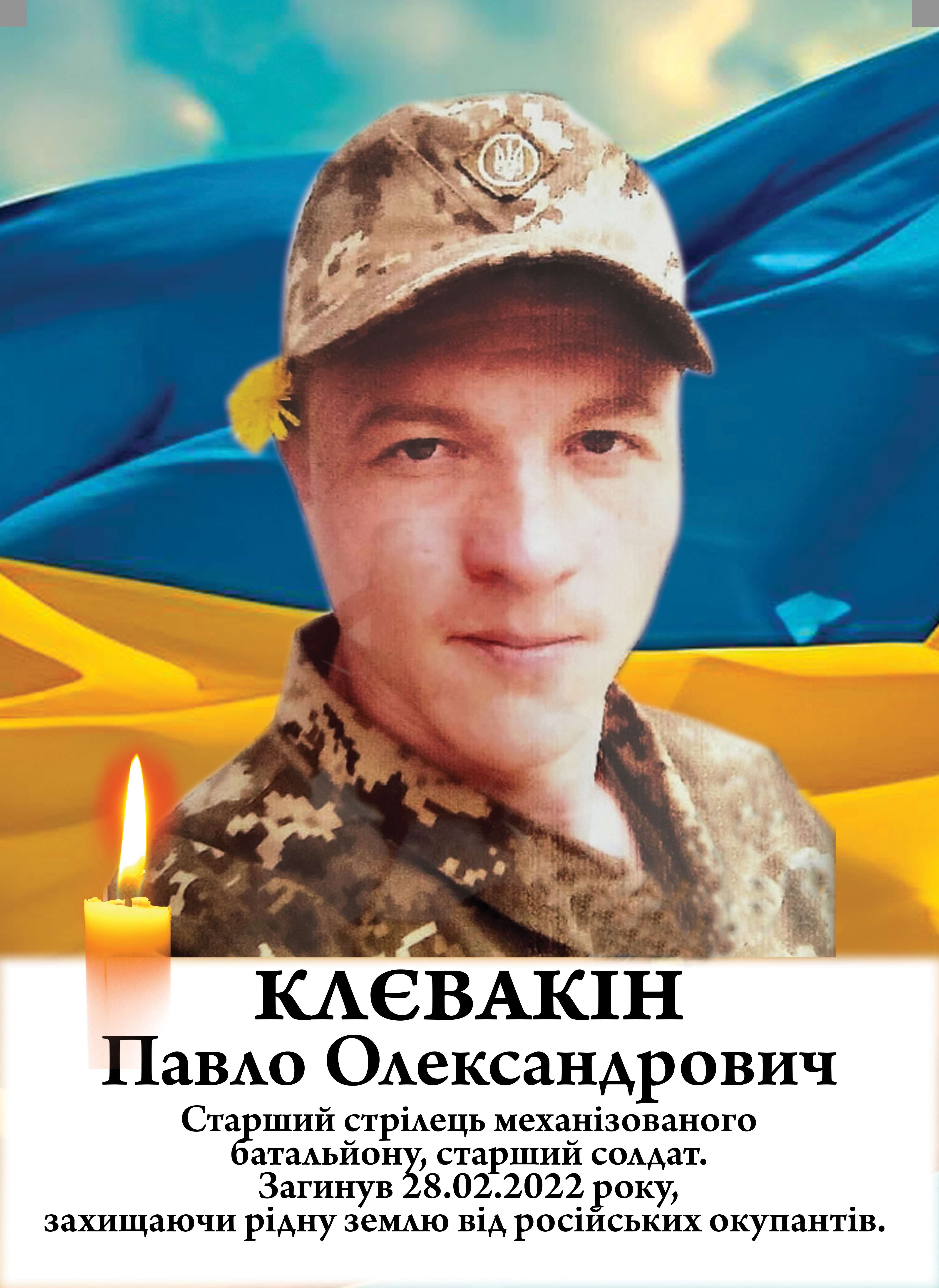 28 лютого 2022 року в селі Велика Писарівка, що на Сумщині, Павло Клєвакін загинув внаслідок вибухової травми, виявивши відданість присязі. Йому було 27 років. У Захисника залишилася дружина, донька, батьки.