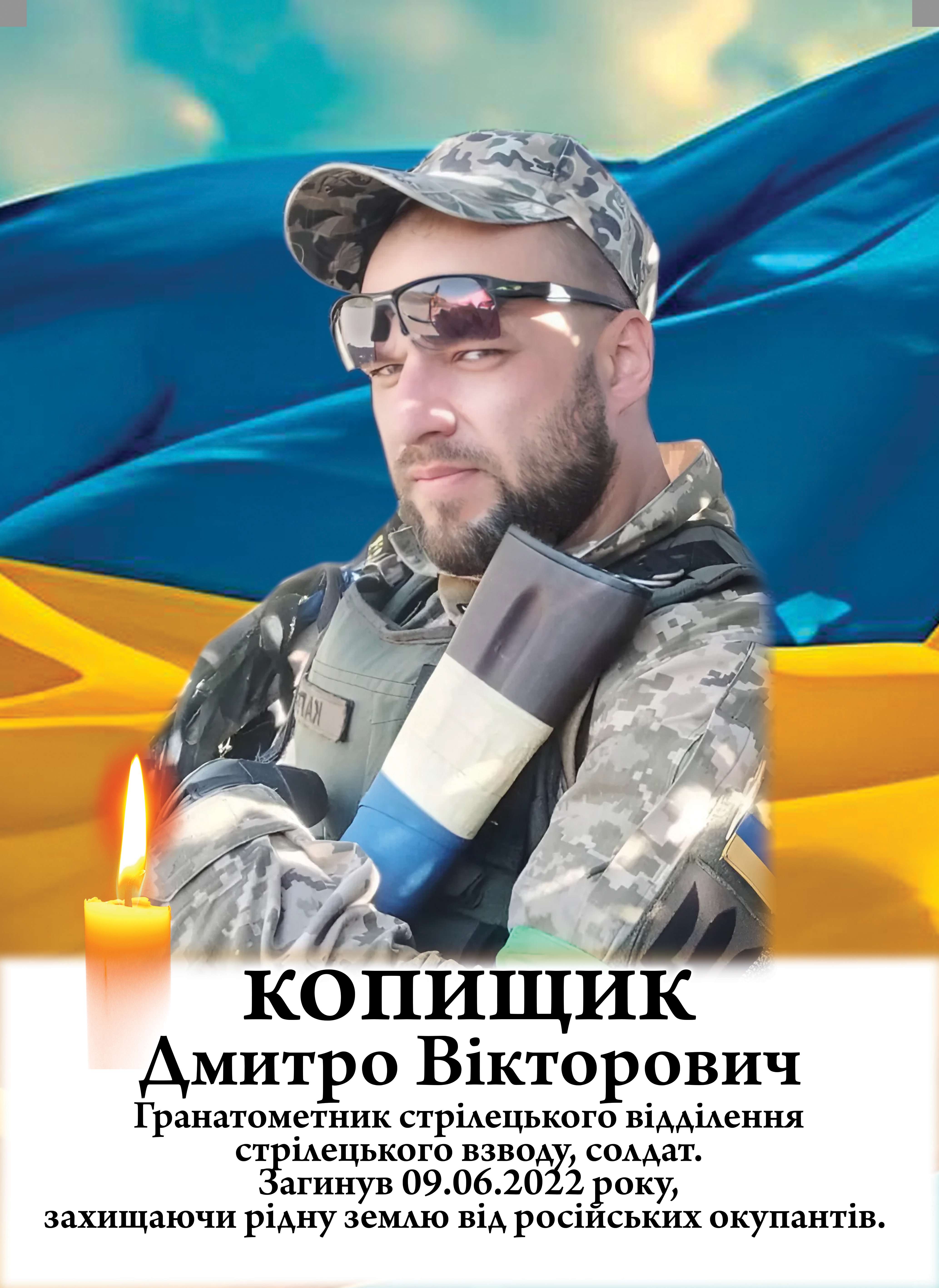Дмитро Копищик загинув 9 червня 2022 року у с.Перемога, захищаючи свободу і цілісність України, виявивши мужність, стійкість і відданість присязі.