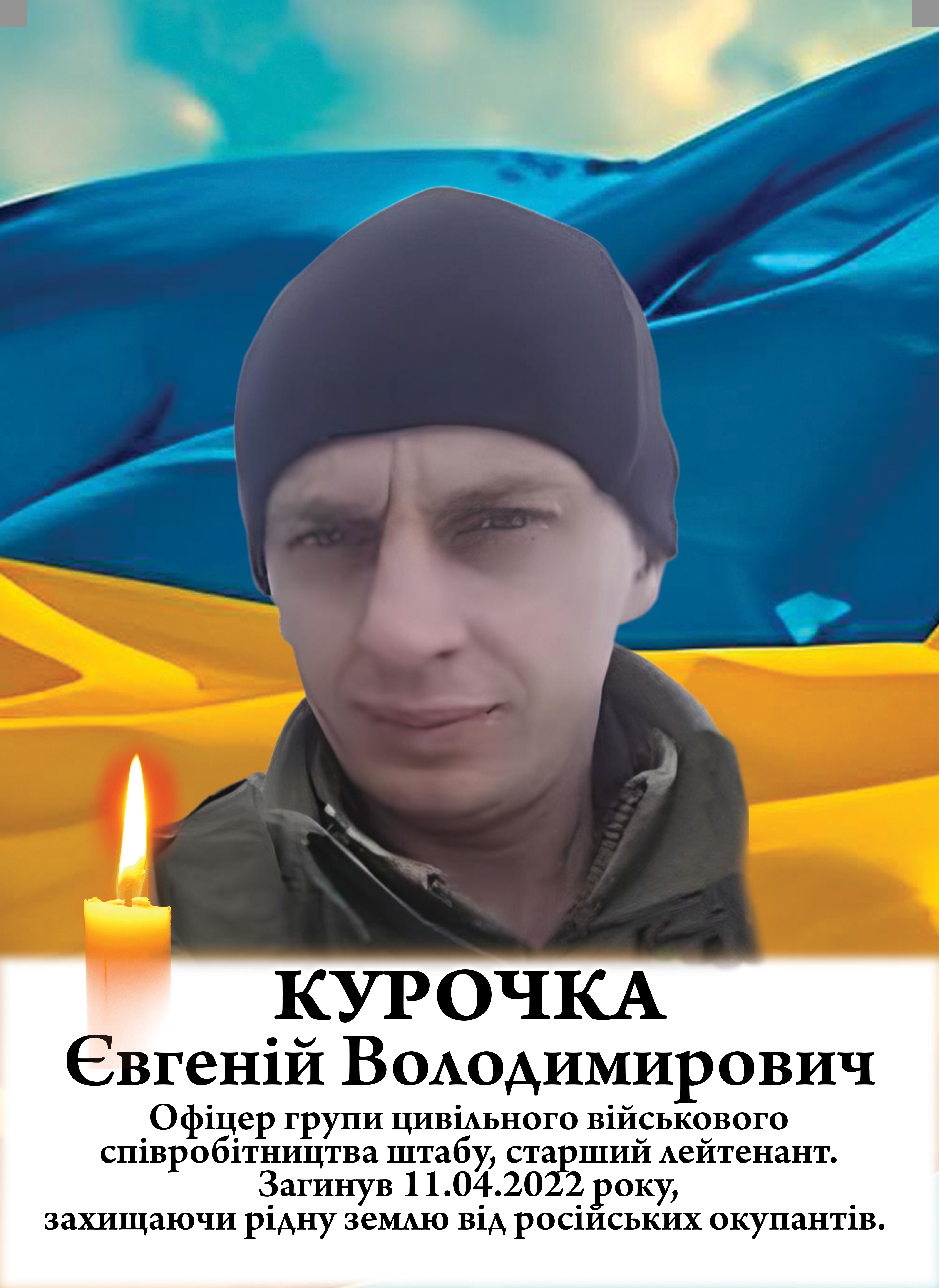11 квітня 2022 року старший лейтенант Євгеній Курочка загинув, отримавши поранення, несумісні з життям, виявивши мужність, стійкість та відданість присязі.