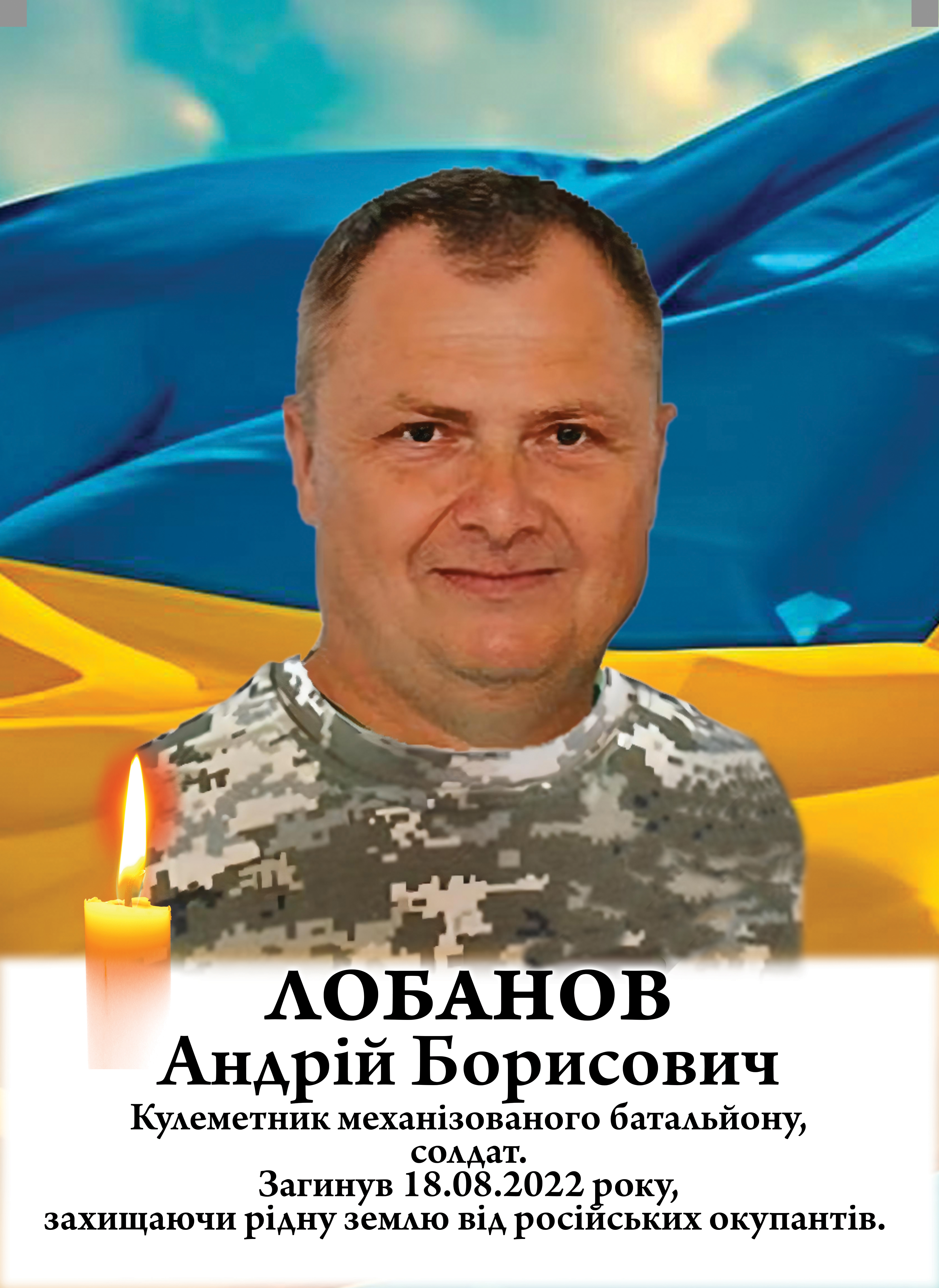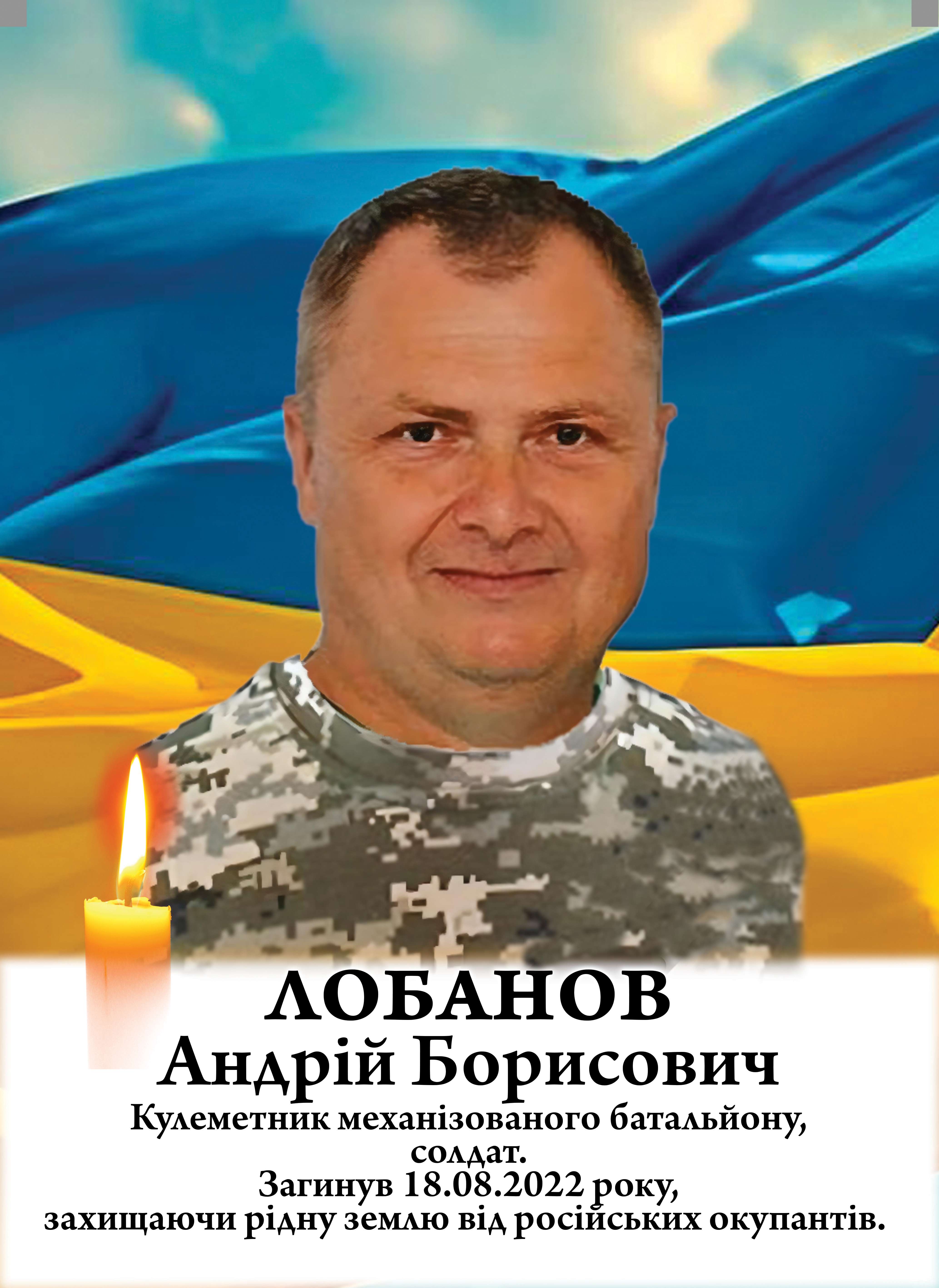 Андрій Лобанов загинув 18 серпня 2022 року у Мар’їнці Донецької області, тримаючи оборону, виявивши мужність, стійкість та відданість присязі.