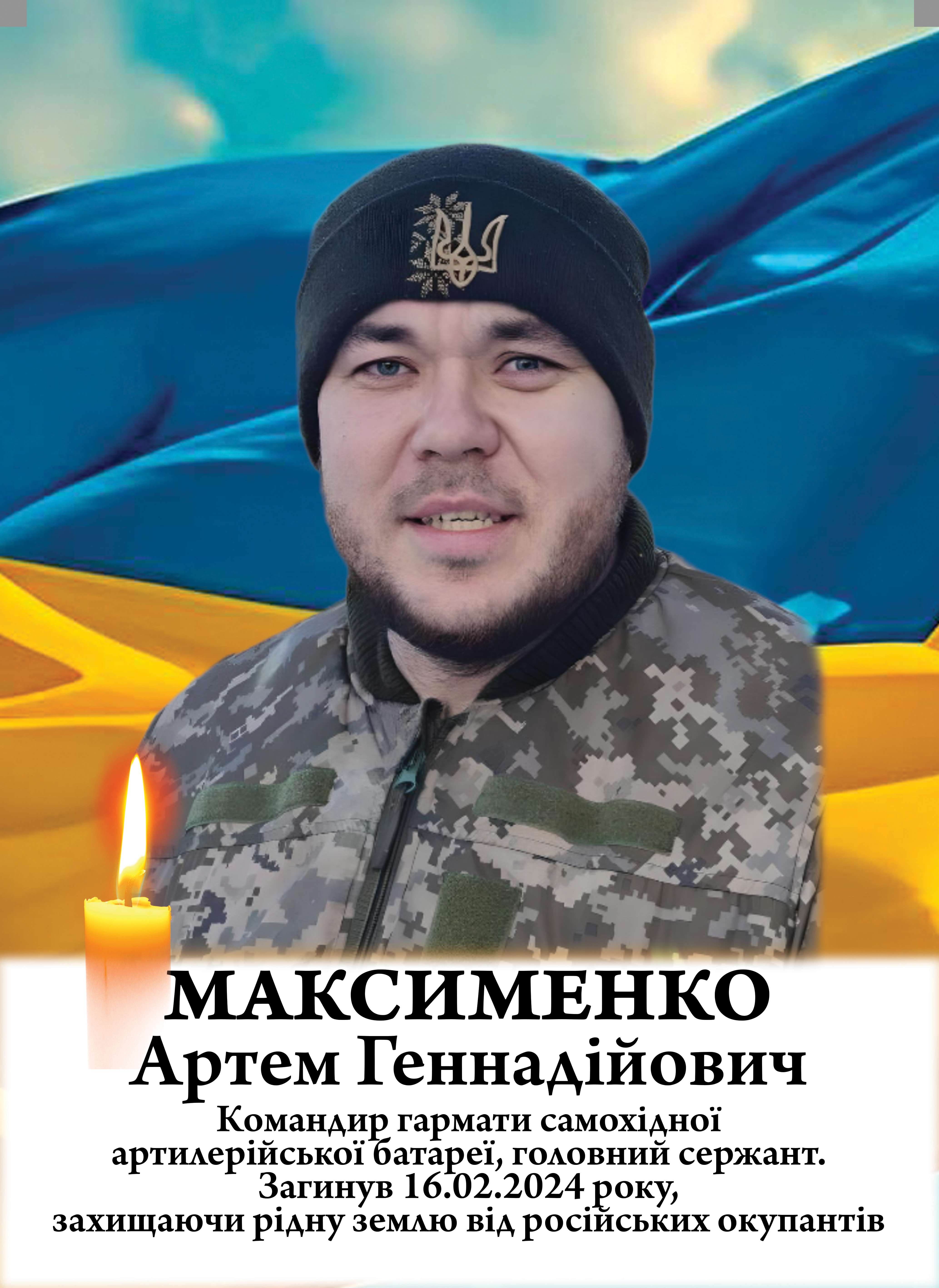 У складі бригади воював на Ізюмському, Лиманському та Куп’янському напрямках, здійснював бойові операції, підтримував побратимів, знищував ворожу техніку та живу силу противника. 16 лютого 2024 року під час виконання розвідувального завдання поблизу Новоселівського Луганської області старший сержант, командир гармати Артем Максименко загинув унаслідок ворожого артилерійського обстрілу, виявивши мужність, стійкість і відданість присязі. Воїну було 31 рік. У нього залишилися мама, сестра.
