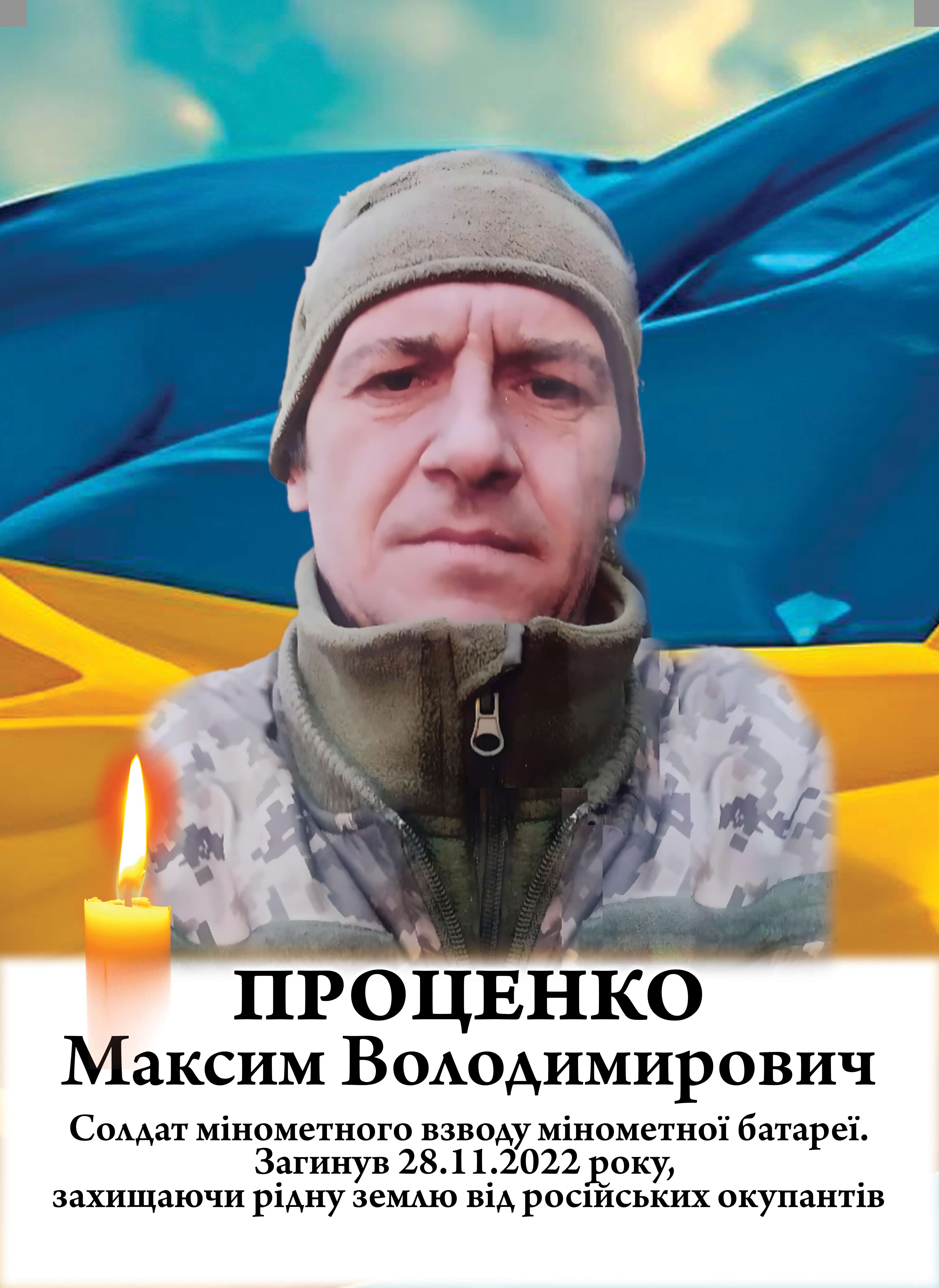 28 листопада 2022 року, після важкого поранення, Максим Проценко помер у лікарні міста Костянтинівка від ран, несумісних із життям. Йому було 38 років. Удома на Максима чекала дружина.