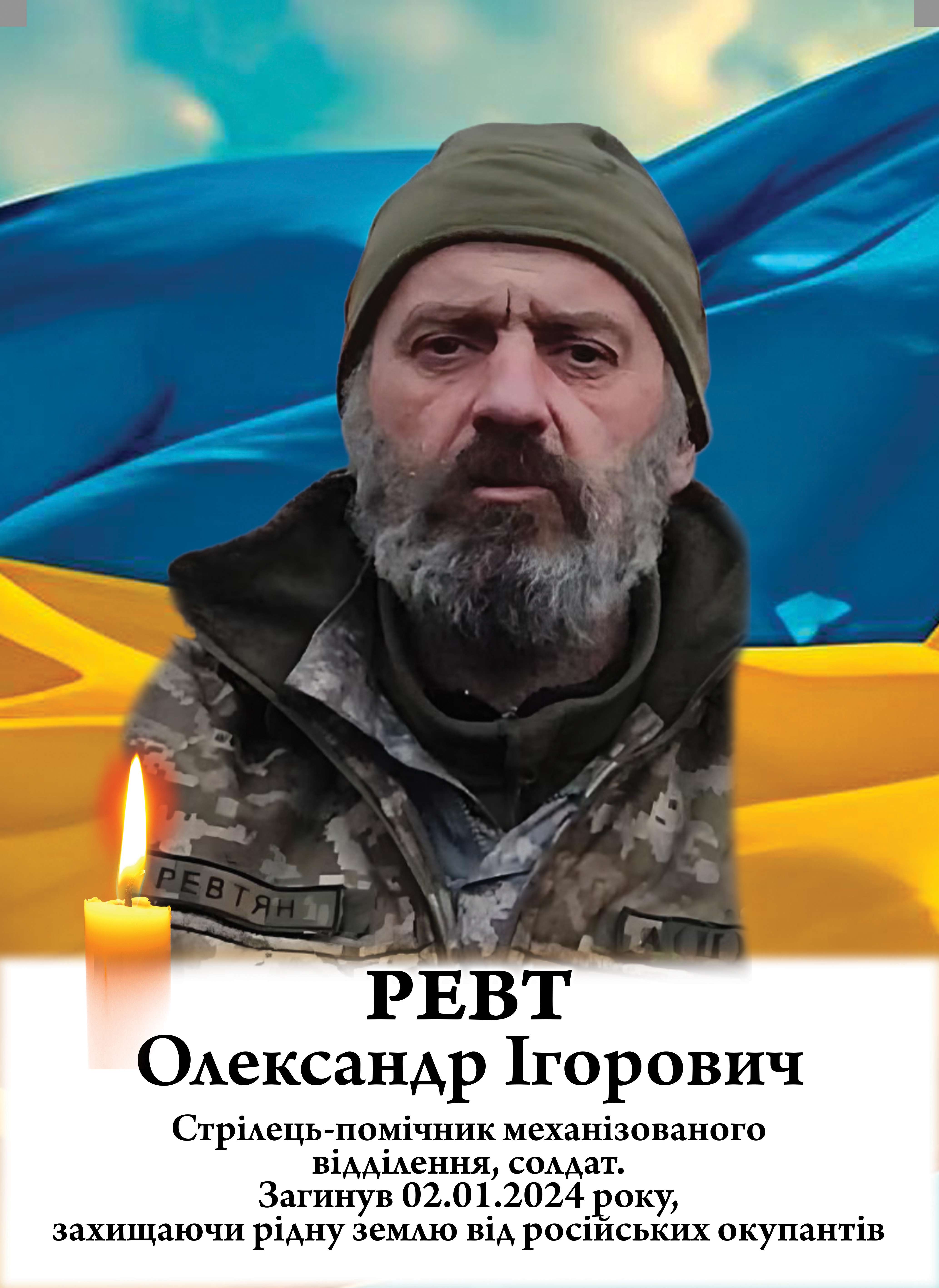 Олександр Ревт загинув 2 лютого 2024 року поблизу н. п. Очеретине Донецької області, виборюючи в бою свободу і незалежність України, виявивши мужність, стійкість та відданість присязі. Воїну було 52 роки, в нього залишилися батьки, сестри, донька, дві онучки.