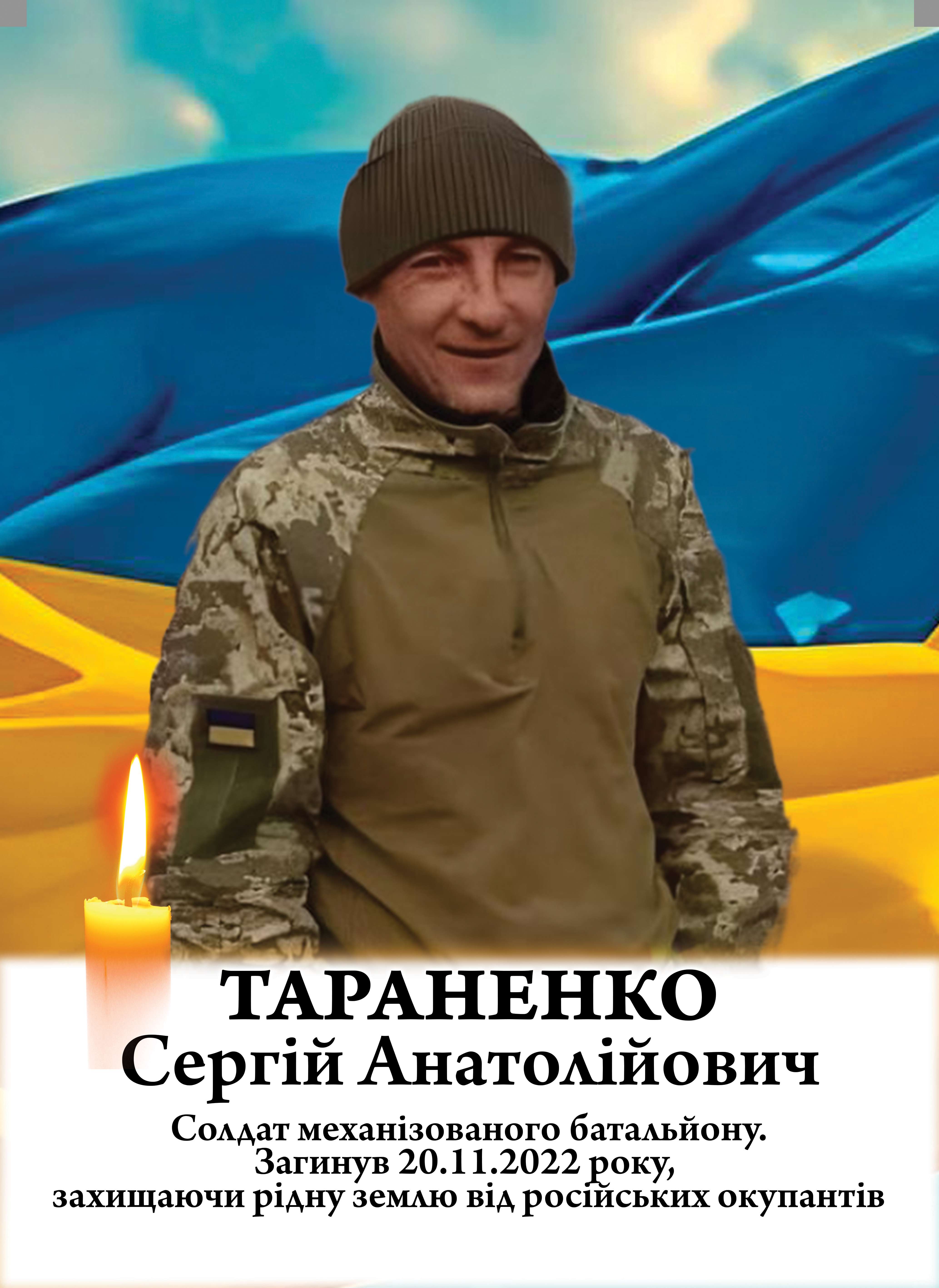 Сергій Тараненко загинув 20 листопада 2022 року на Донеччині, поблизу н. п. Спірне, виявивши мужність, стійкість та відданість присязі.